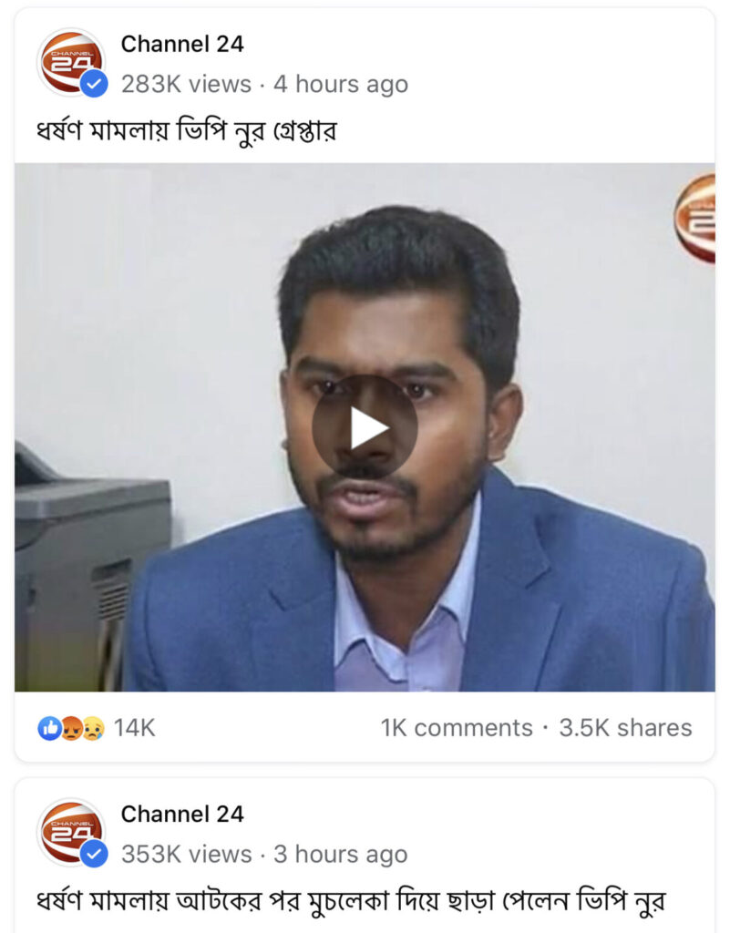 মূল ধারার বেশ কয়েকটি সংবাদ মাধ্যমসহ অনেক মিডিয়া গত রাতে (সোমবার রাতে) সংবাদ প্রকাশ করে যে ডাকসুর সাবেক ভিপি নুরুল হক নুরকে ধর্ষণ মামলায় আটক করা হয়েছে। এটি সম্পূর্ণভাবে ভুল।প্রক্রিত,…